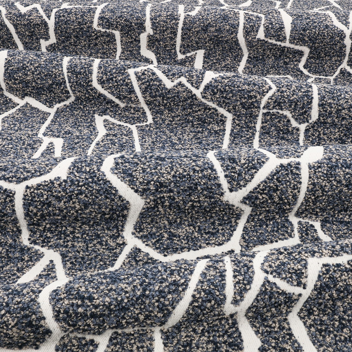 Als Schwestergewebe zum Indoor-Stoff Gion FR präsentiert diese Outdoor-Variante dasselbe markante Muster, das an verkohltes Holz erinnert. Charaktervolle Bouclé-Garne akzentuieren die Oberfläche und erzeugen die Illusion, als würde sich das Design vom Stoff abheben.