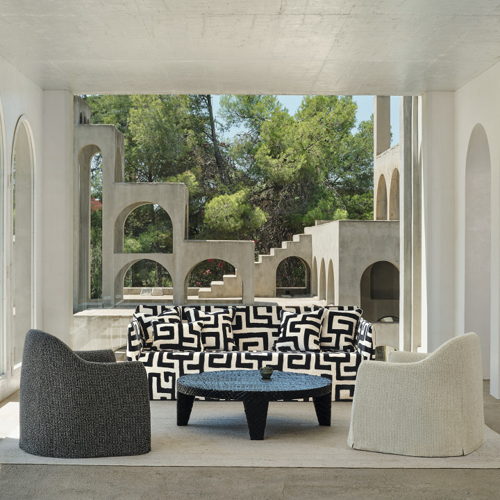 Dekoratives Outdoor-Gewebe mit Gittermuster und Bouclé-Garn, das einen Touch von Tweed verleiht. Unerwartet weich und unbestreitbar praktisch, ist Eivissa ein dezentes Statement für Outdoor-Polster und -Accessoires.