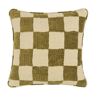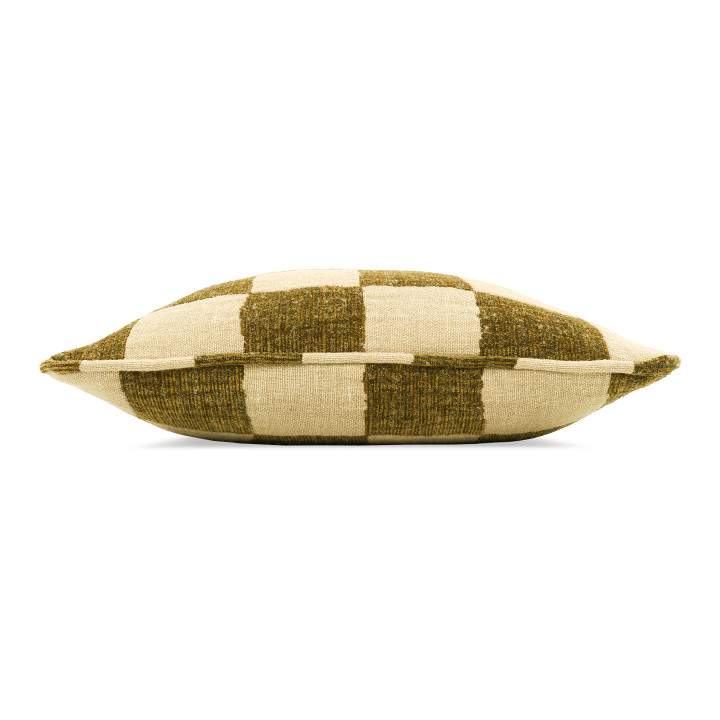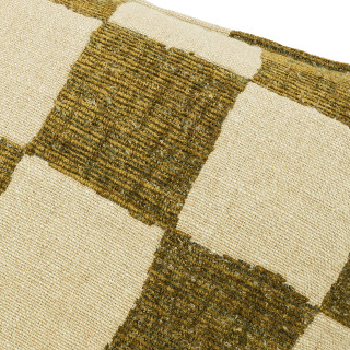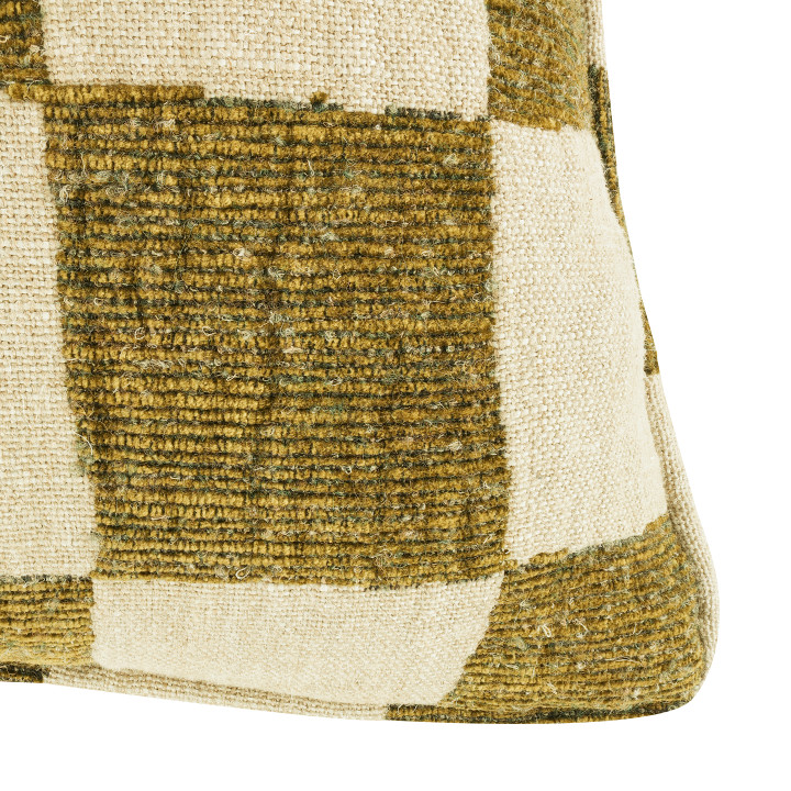 Checkmate es un cojín tejido en telar rústico que alterna cuadros de una mezcla de chenilla y lana con otros de lino y yute, creando un diseño de tablero de ajedrez intencionadamente imperfecto.