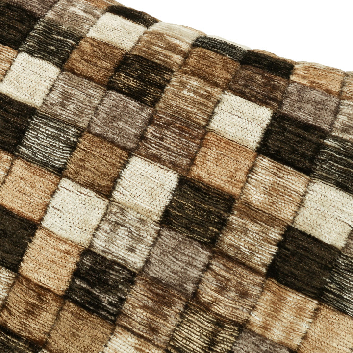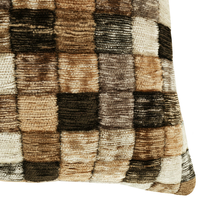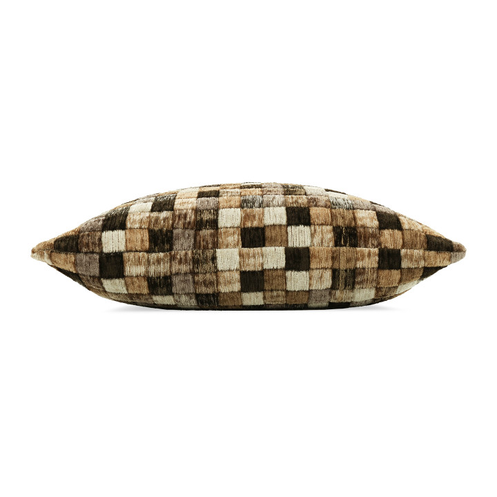 Campden – pronunciato con la “p” muta – è ispirato alle piastrelle di una piscina e si presenta come una coperta di quadrati colorati che formano un vivace disegno a mosaico. Il pelo in ciniglia dona profondità e movimento alla superficie, creando un effetto trapuntato e tridimensionale che rende il cuscino tutt’altro che piatto.