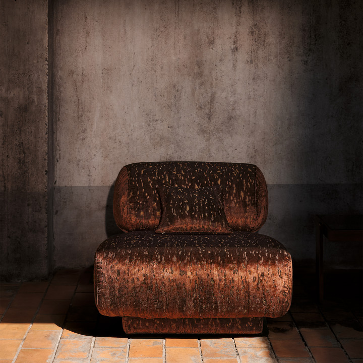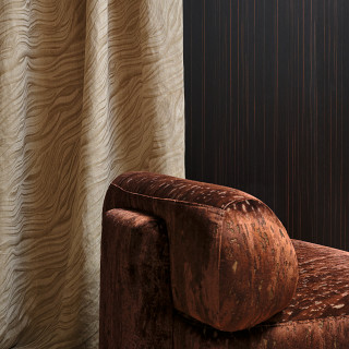 Utilizzato in molti progetti dello studio Dieter Vander Velpen Architects, il travertino è una pietra naturale con una superficie inconfondibile caratterizzata da scanalature e cavità decorative. Questo motivo innovativo riflette questi segni distintivi, creati attraverso un morbido velluto che spicca su un fondo jacquard lucido. Una delicata stampa è applicata al pelo, conferendo al design un sottile movimento di tonalità che riprende il movimento tipico del travertino.